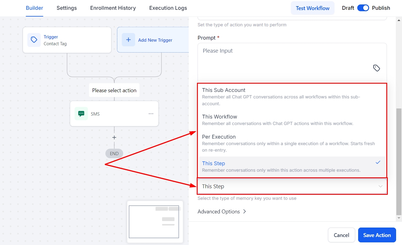 This Sub Account - Retains all GPT conversations across all workflows within the sub-account.