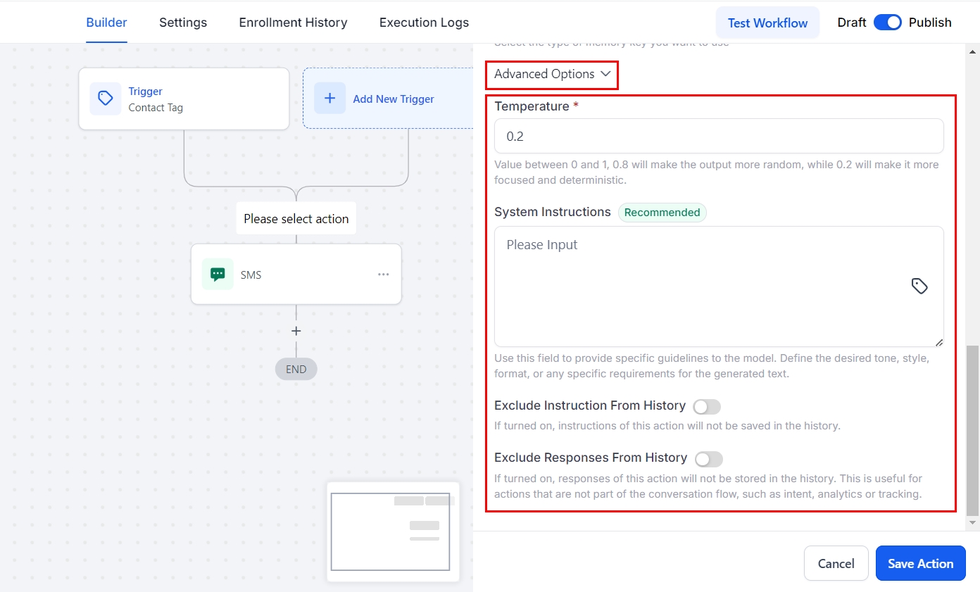Expand the Advanced Options menu to further customize this action according to your specific requirements. This section provides additional settings and configurations to fine-tune the action's behavior and ensure it aligns with your needs.