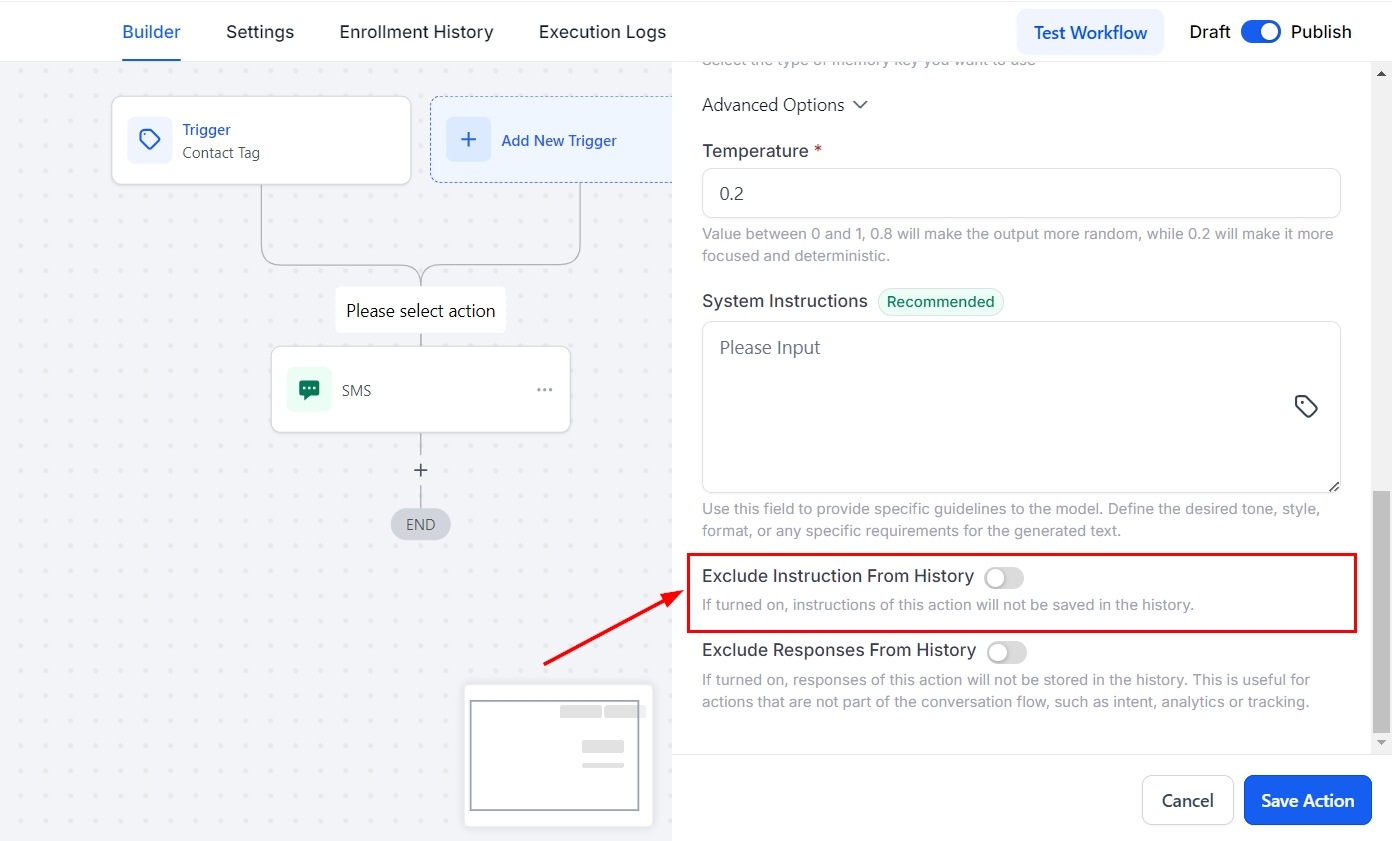 Use this toggle to exclude System Instructions from being stored in the history, ensuring that these instructions do not impact future interactions or analyses.