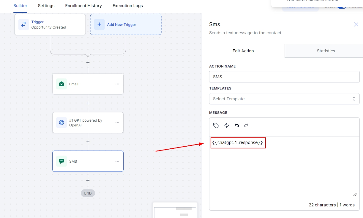 Once the ChatGPT has been configured, the outcomes it generates can be incorporated into subsequent steps within your Workflow. In your process, you would reference these results as {{chatgpt.1.response}}.
