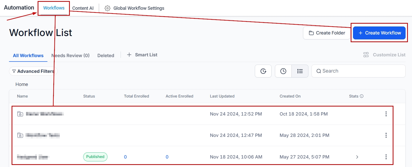 Navigate to the Workflows tab inside the Automation section and create or edit a workflow to open the builder.