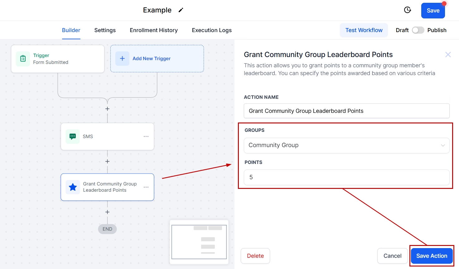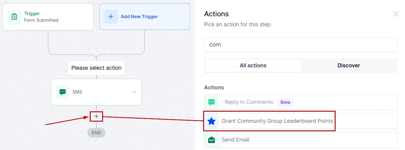 Click the plus sign icon to add an action and select the Grant Community Group Leaderboard Points Action.