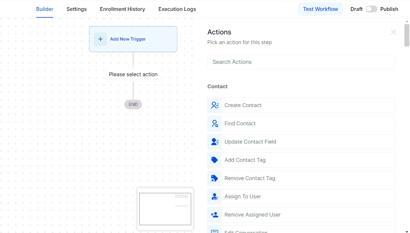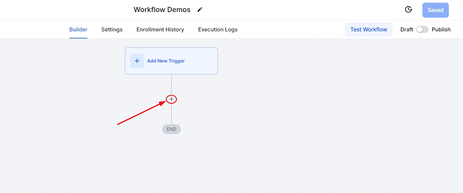 Next, create a new workflow or select a workflow from the list to access its editor and establish the necessary workflow trigger (if necessary). Click the “+” sign to add a new action.