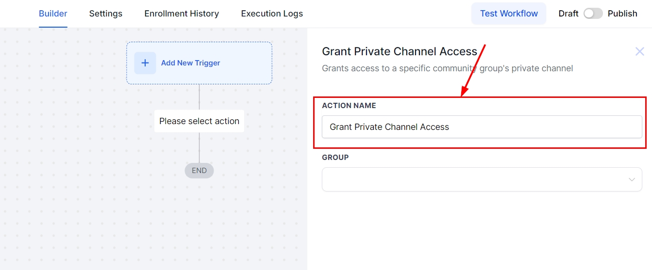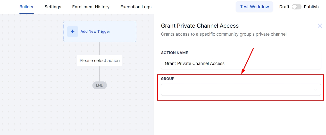 Finally, select the relevant Private channel from the dropdown. Choosing the correct Group and Private Channel is essential for the workflow to function as intended, as it ensures the actions are applied to the appropriate users gaining access to that particular private channel.