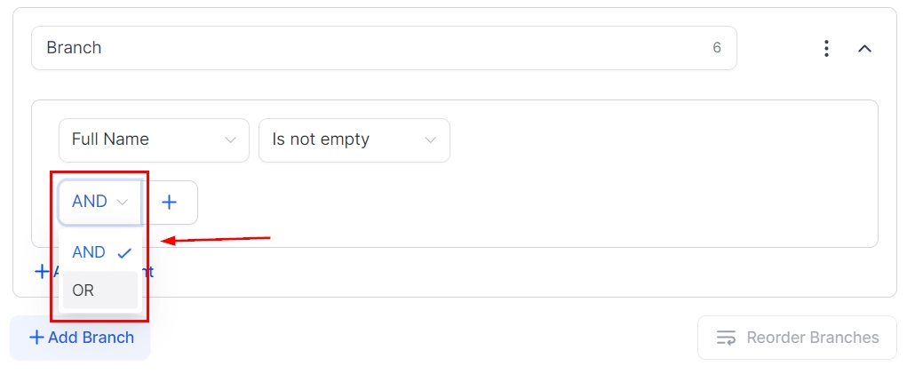 OR option: When selecting this option the contact will qualify for this branch if one of the conditions is met.