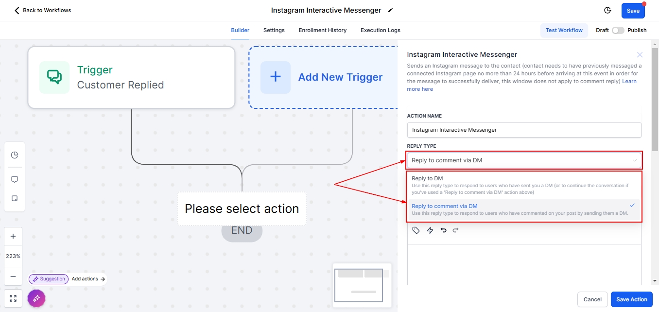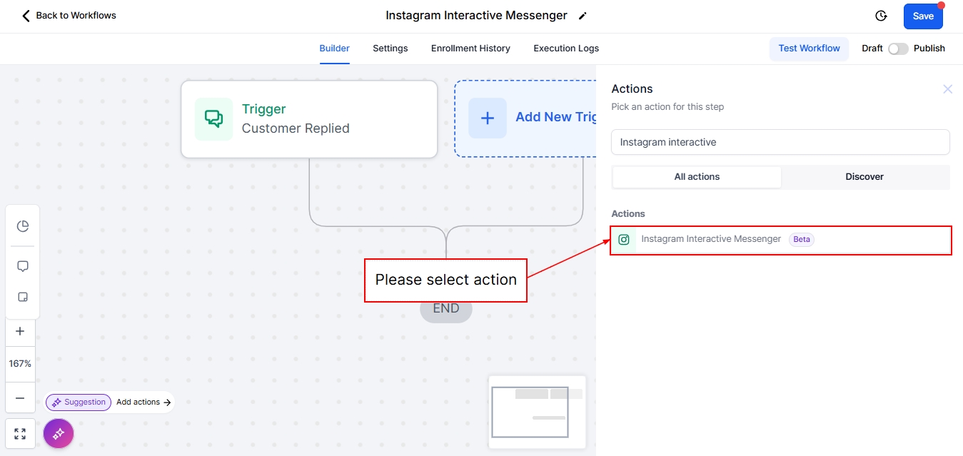 To begin, add a Trigger. For this example, we would be using the Customer Replied trigger, once that is done, and select the Instagram Interactive Messenger Action.
