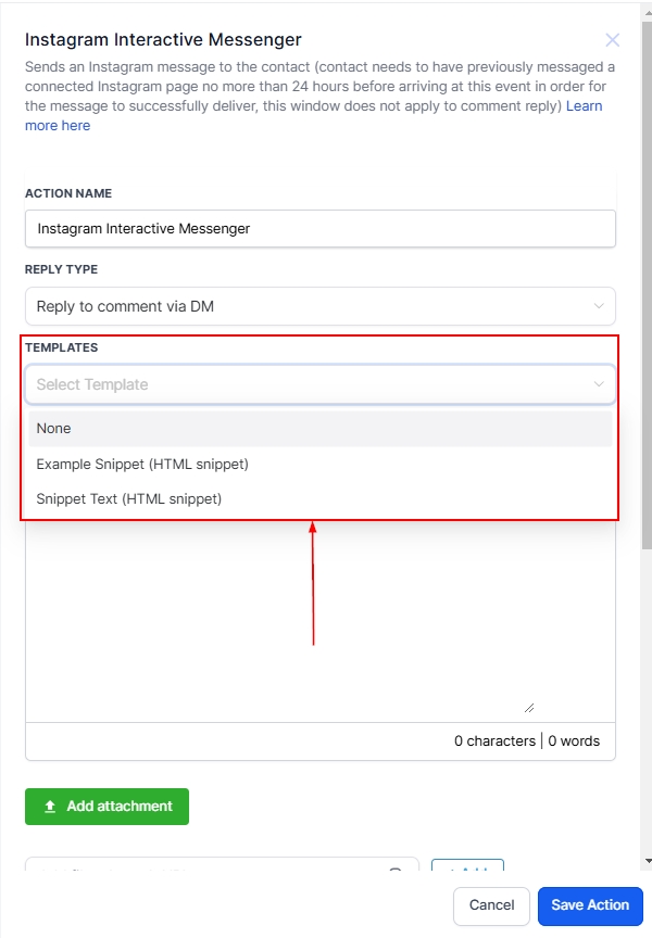 Once your message, attachments, templates, and Quick Replies are configured, click Save Action to complete the setup. Your Instagram Interactive Messenger action is now ready to engage customers effectively.