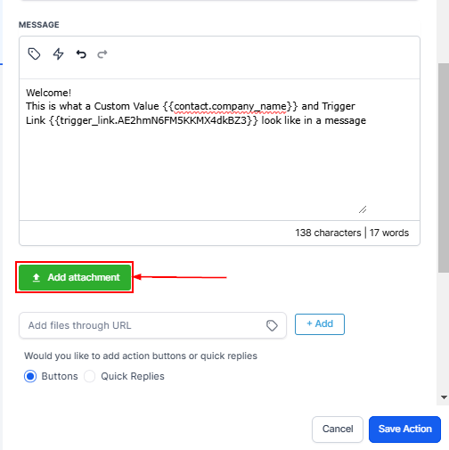 Click the green Add Attachment button to upload files from your computer, such as images, documents, or PDFs. Attachments help provide additional information and make your message more engaging.