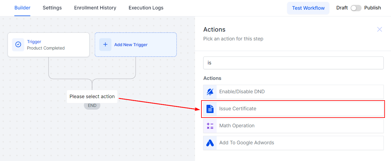 Certificates are one of the most important parts of courses, and there are plenty of ways to deliver them; one is by automating the sending process with workflows. Using workflows, you can seamlessly issue certificates when tasks are completed or products are finalized.To begin, click on the β+β icon in your workflow builder. From there, search and select the Issue Certificate Action.