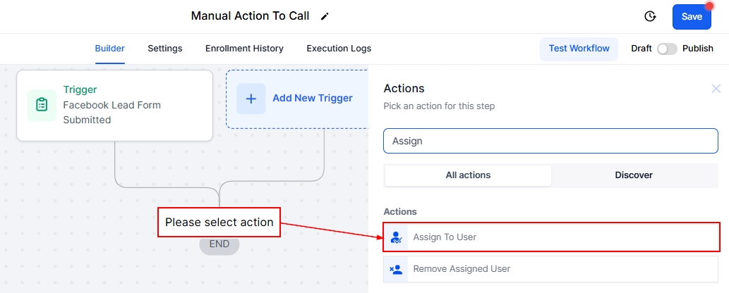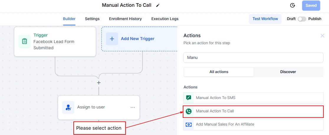 Adding Manual Action to Call into your workflows ensures timely communication with your contacts. Assign tasks, customize and add more actions that suit the purpose of the workflow, and save your workflow to keep everything running smoothly while staying adaptable to your team’s needs.