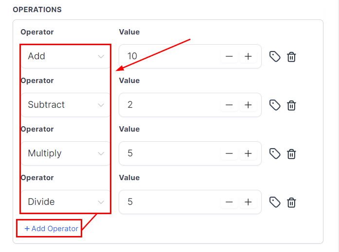For Numerics fields you can Add, Subtract, Multiply, or Divide as well as add multiple operations for the system to run.