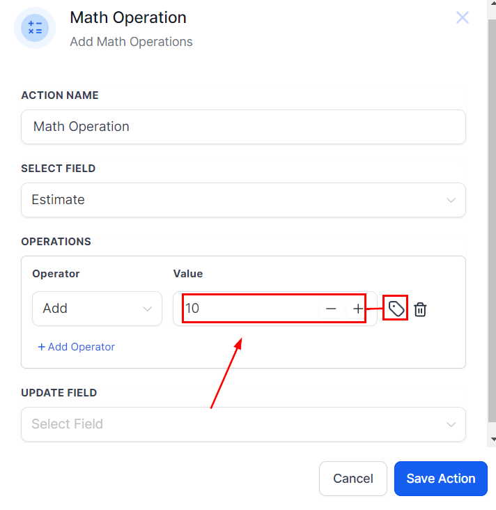 Add the value to perform the operation, the tag icon will allow you to choose the custom values you have created inside of your system for this field.