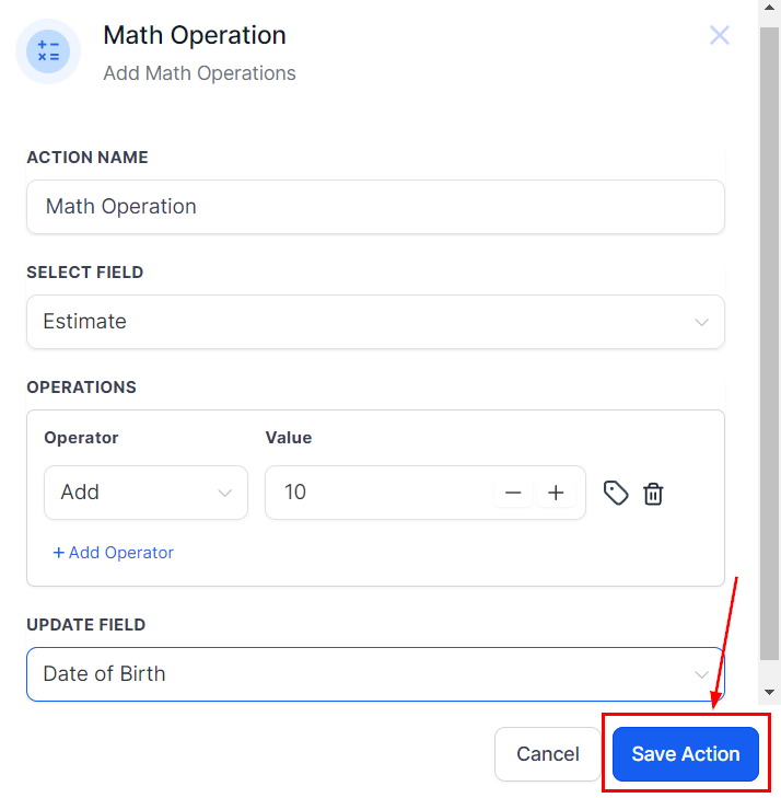 The Math Operation action makes the system seamlessly handle any calculations needed by adding them to a workflow where they can be used to maintain score metrics or total fields. For example, this function can be used to give scores to leads based on their responses and activities in a marketing campaign.