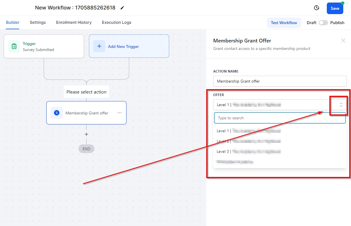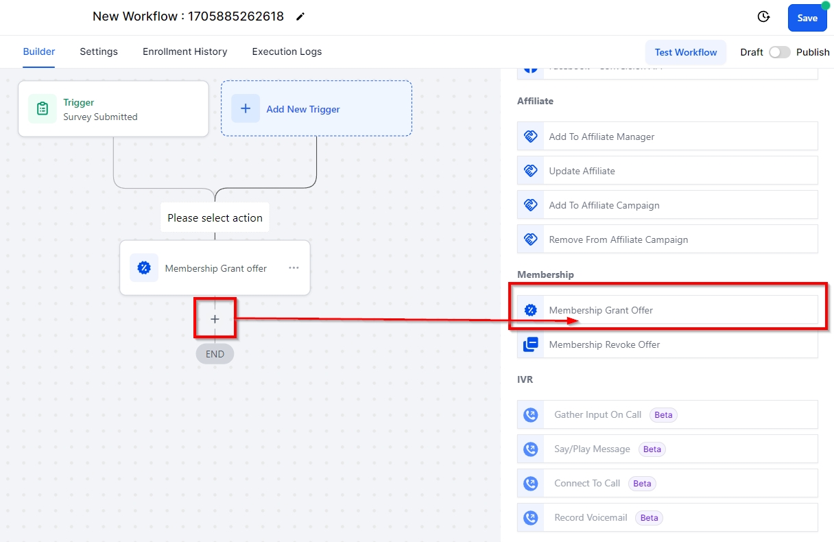 To grant a contact access to a membership product, click on the + symbol to add a new workflow action, and choose Membership Grant Offer. Next, select the desired membership offer from the drop-down menu to which you want to give contact access within this specific workflow. Once you’ve selected the offer, make sure to rename your workflow action accordingly and click the Save button in the bottom right.