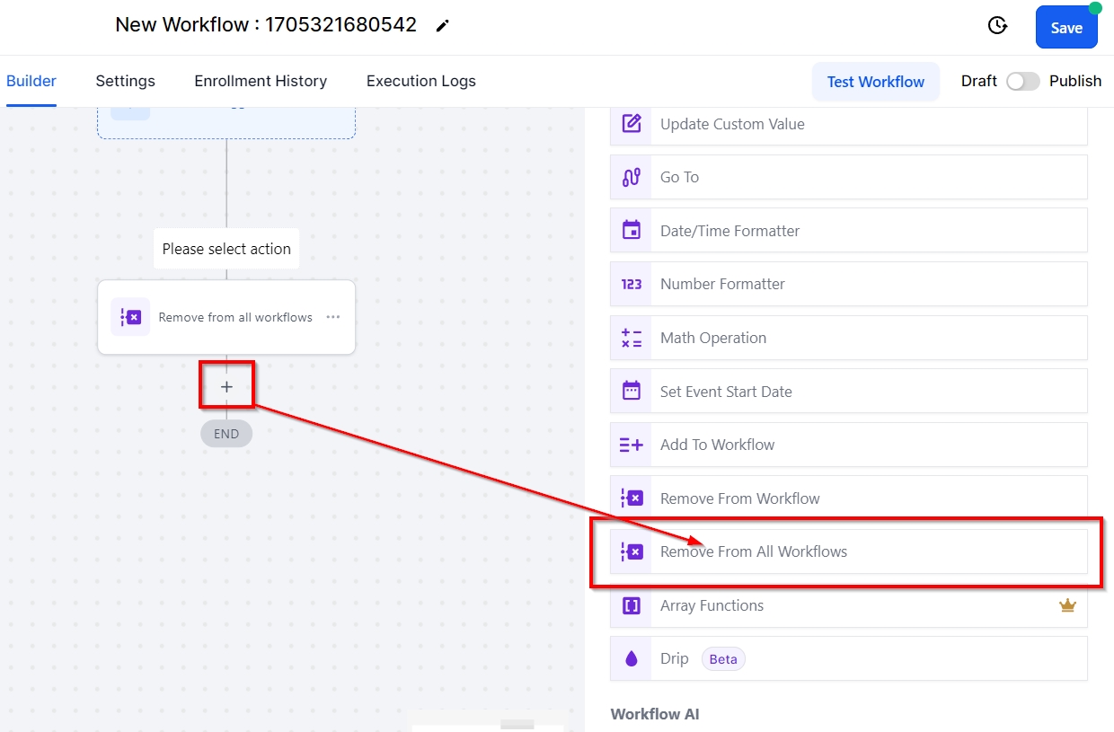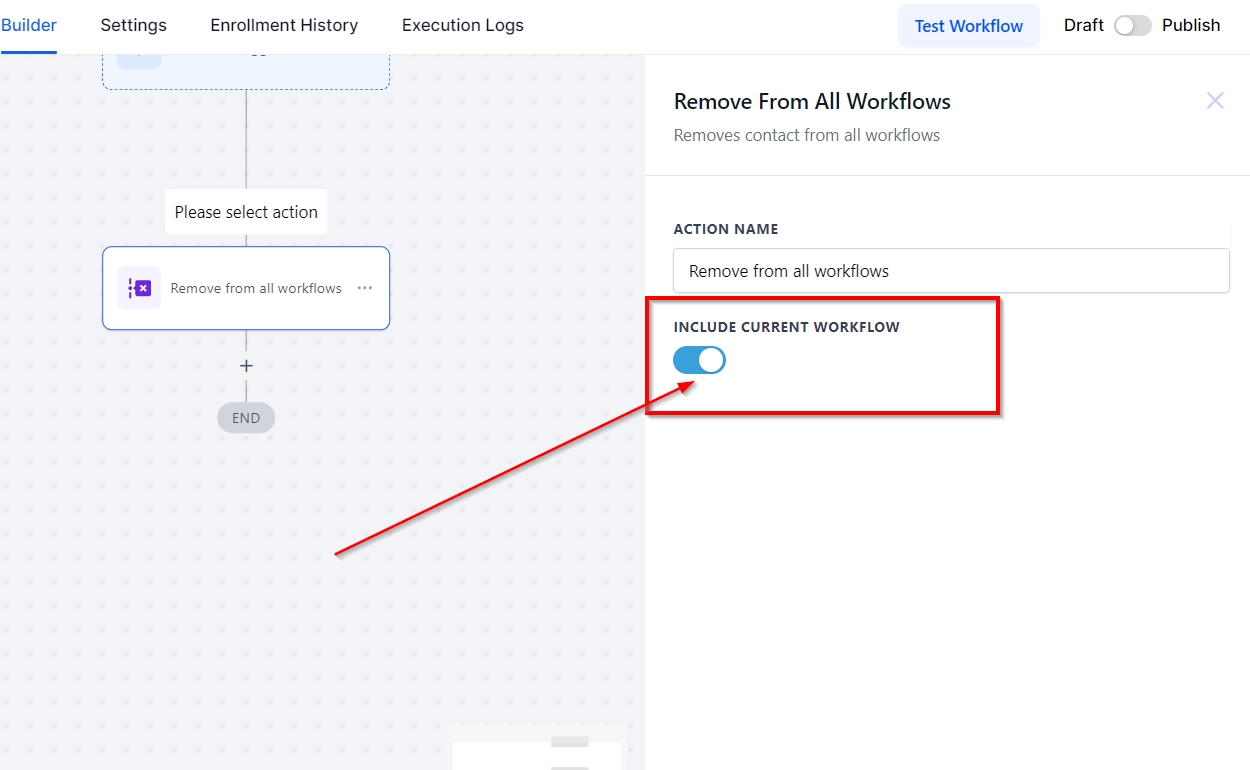 Using this action, users can remove a contact from all workflows, including the one they are currently building by selecting the Include Current Workflow option. Utilizing this workflow action is useful when you have contacts that you want to easily remove from all workflows in your CRM.