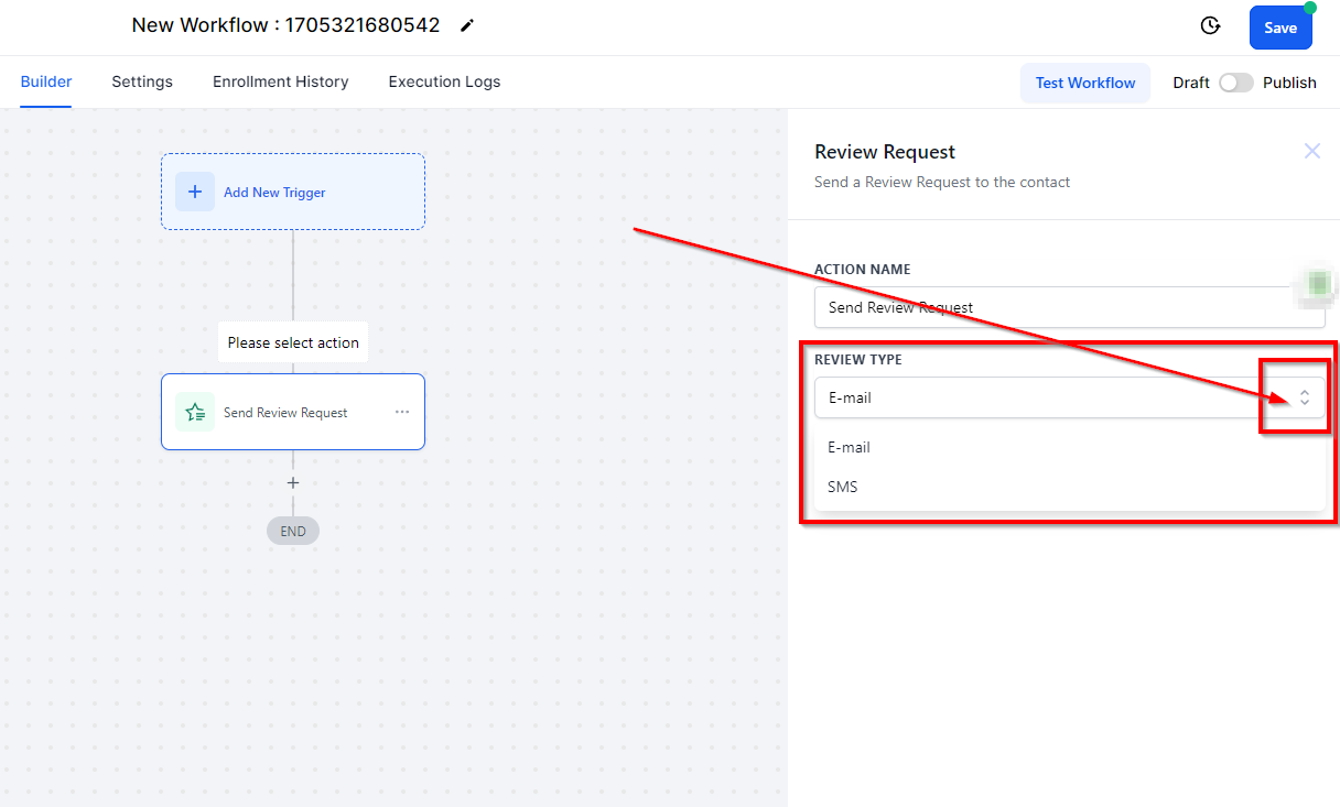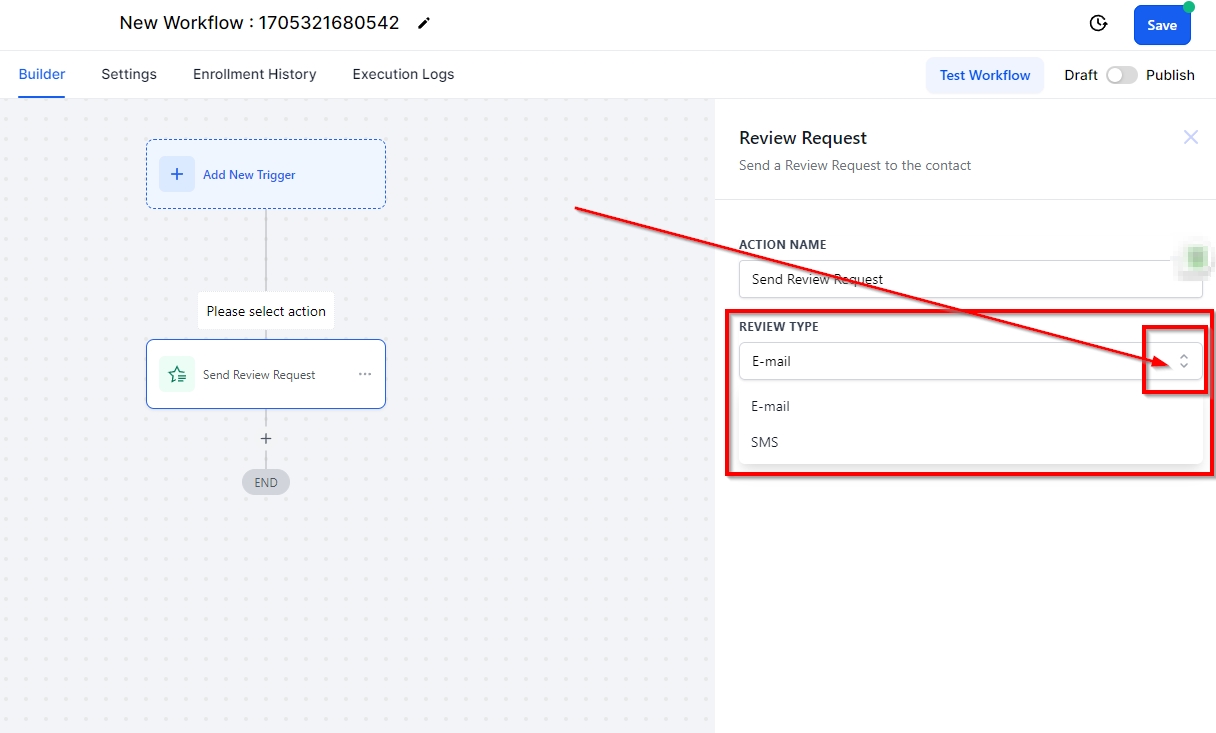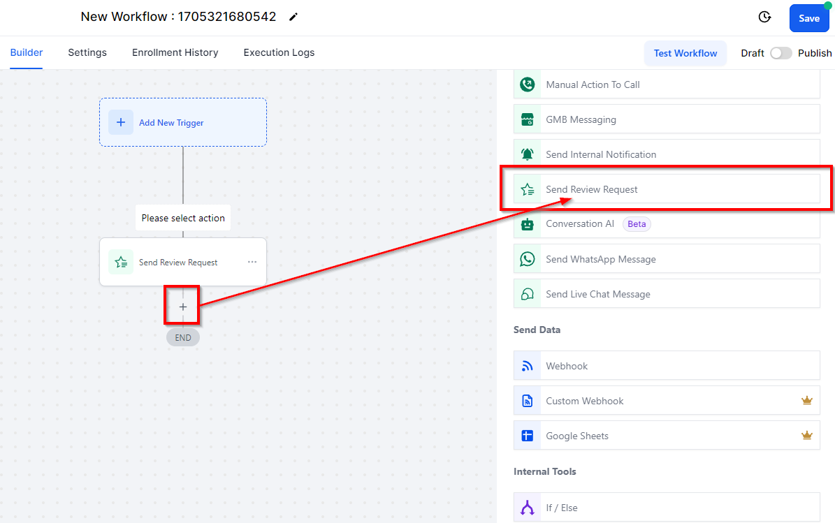 To solicit a review from a contact, users are advised to opt for the Send Review Request workflow action. This command dispatches a review request to the specified contact. To initiate the process, simply click on the designated "+" icon and choose the Send Review Request option. By doing so, you can effectively gather valuable feedback from your contacts, contributing to improved customer relations and enhancing the overall quality of your products or services.