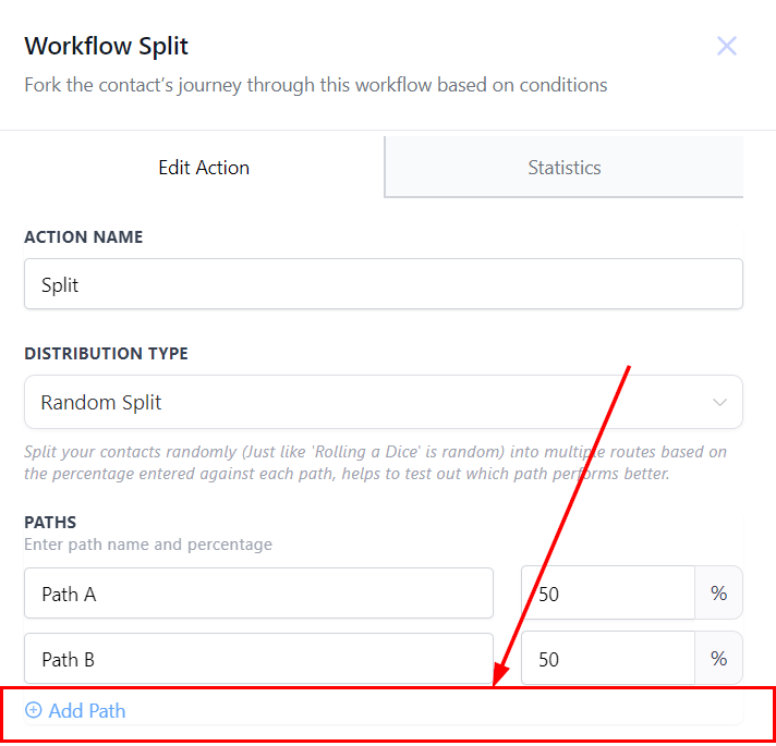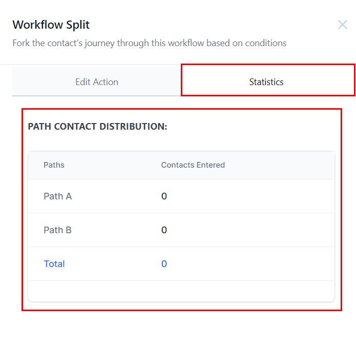 To view statistics, click on the “Statistics” button to see the distribution of contacts across paths. Ensure the “Stats View” is enabled to see stats directly in the workflow.