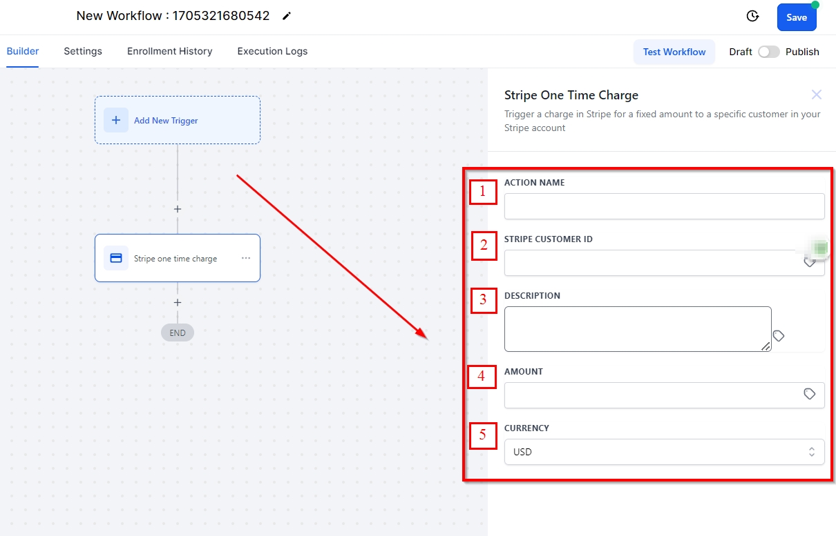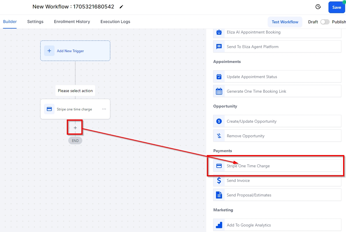 To trigger a charge in Stripe for a set amount to a particular customer in the user's Stripe account, select the Stripe One Time Charge workflow action. This feature charges the specified amount to the customer's account. To begin, click on the + icon and choose Stripe One Time Charge.