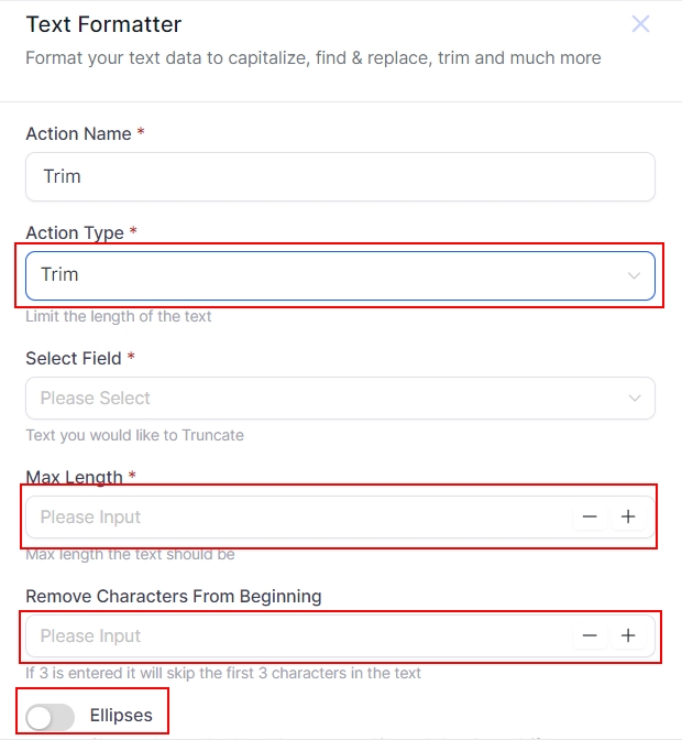 Trim: Shortens the text to a specified length, this can remove characters from the beginning or replace the text after a certain point with ellipses.