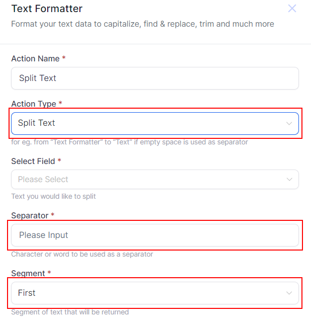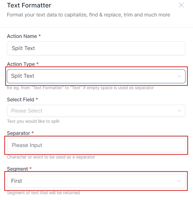 Split: Splits the text into multiple segments based on a specified delimiter, the segment you select will be the new text in the field.