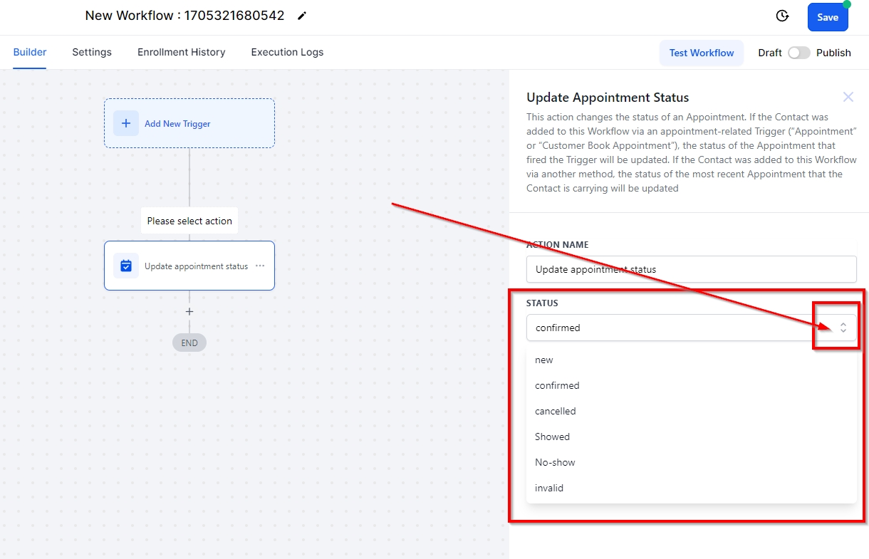 The Update Appointment Status workflow action allows users to change the status of an appointment. If a contact was added to the workflow via an appointment-related trigger such as Appointment or Customer Book Appointment, the status of that appointment will be updated.
