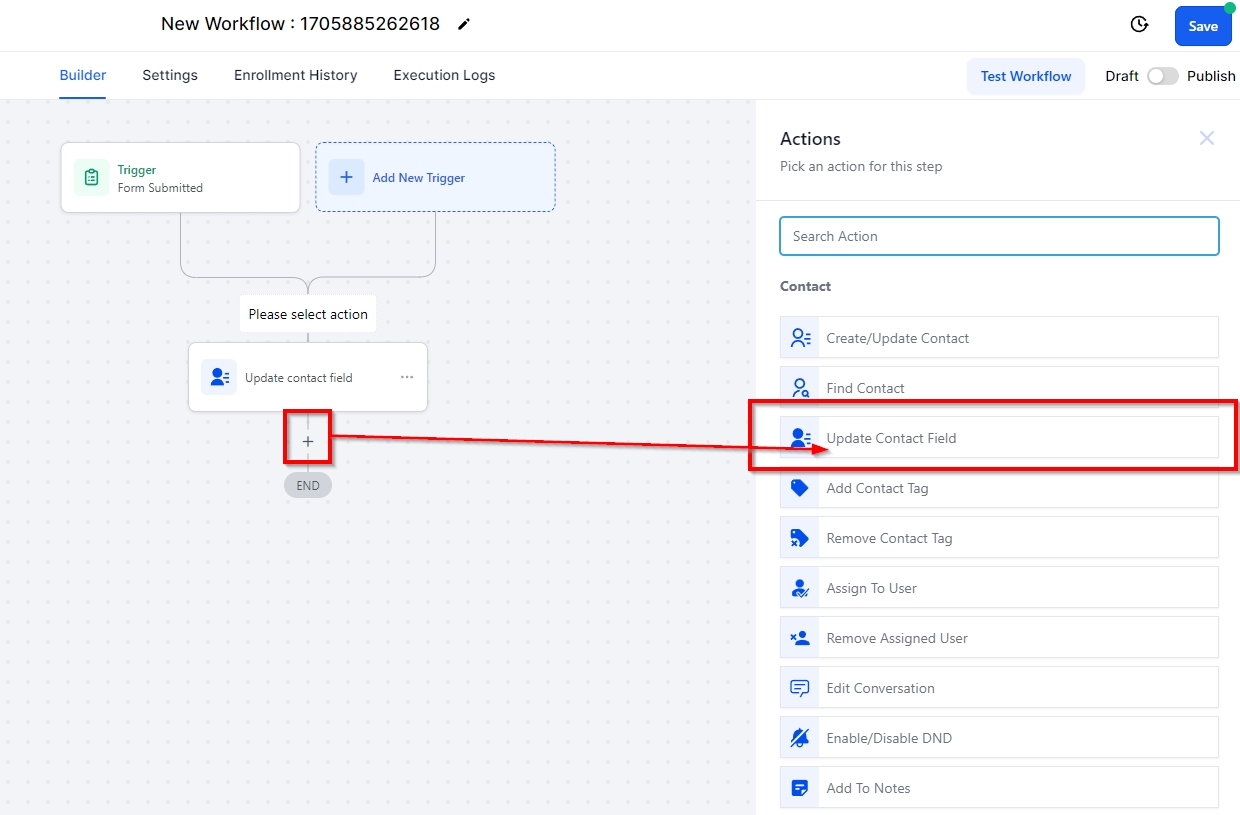 To begin, click on the designated + icon to add a new workflow action and select Update Contact Field. From there, users can choose to update the field data or clear existing field data. Next, click on +Add Field.