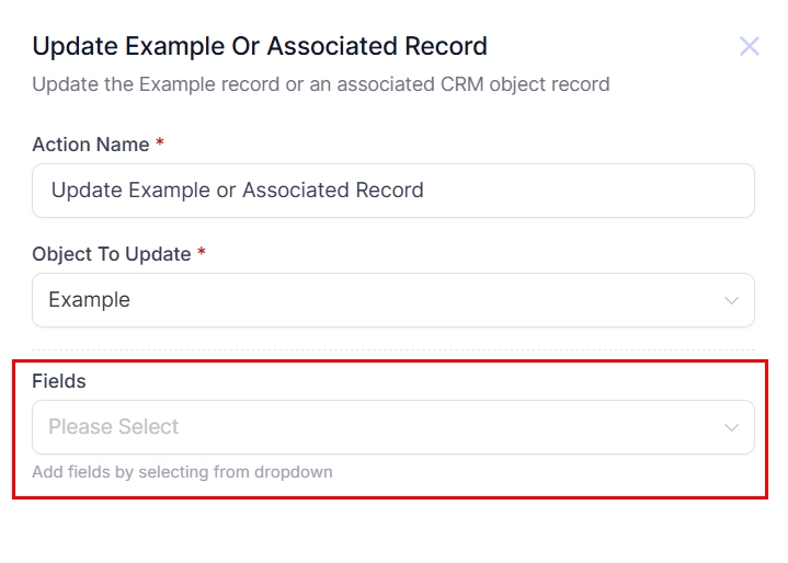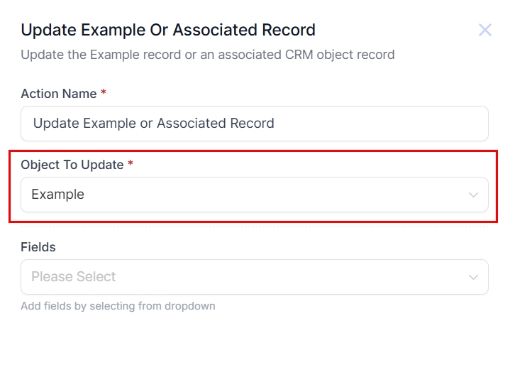 Choose the fields to be updated by selecting them from the dropdown menu. This enables you to use custom objects and custom values to update details in the object record.