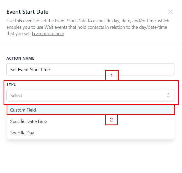 Within the action settings, choose the type as a custom field. This allows you to specify which opportunity custom field you want to use for the event start date.