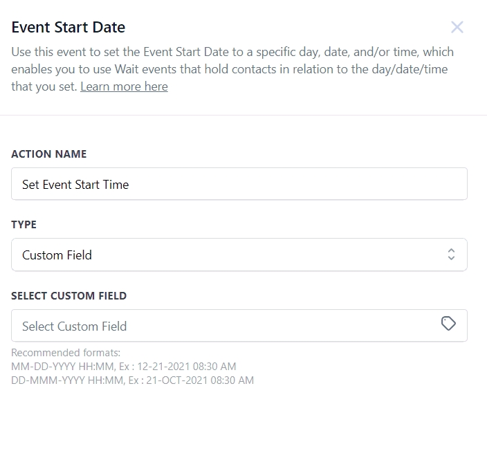 When configuring an event start date action, you can now utilize opportunity custom fields. This is particularly useful for workflows that are opportunity-based.