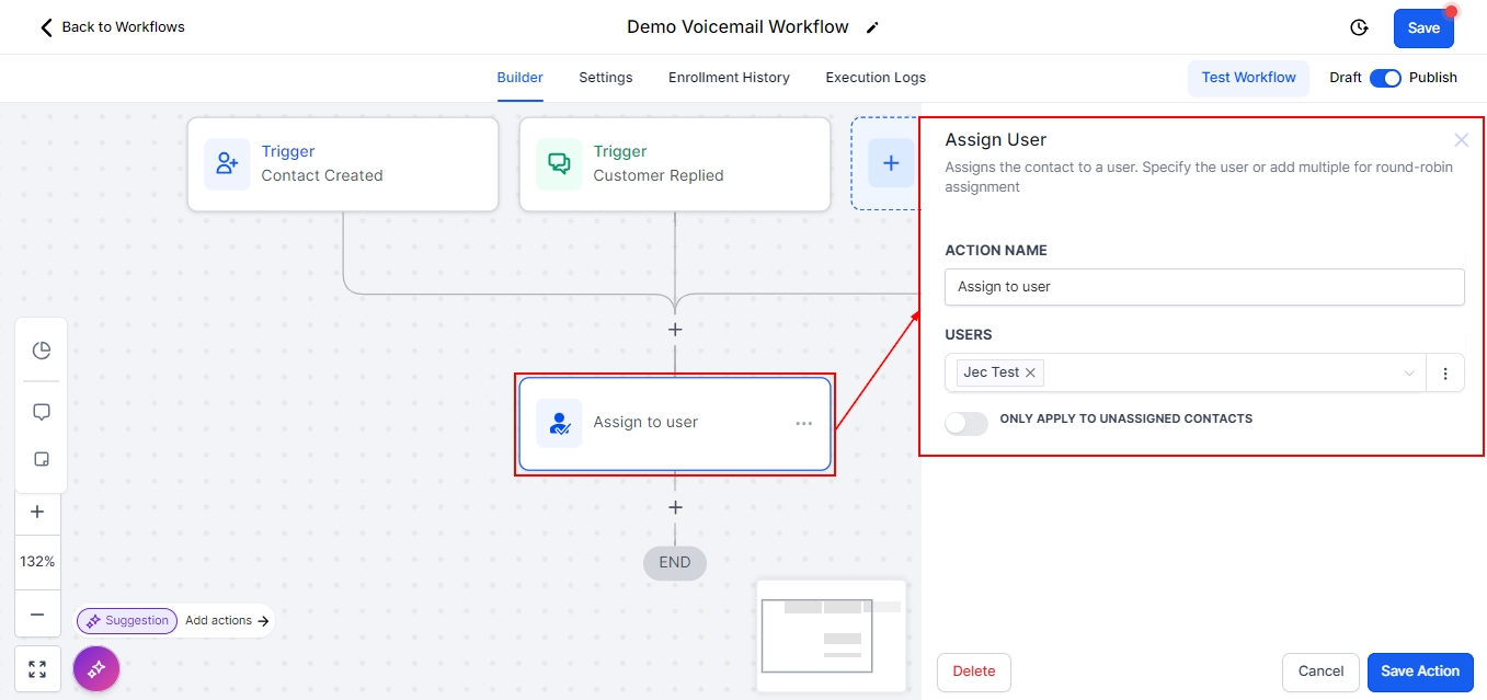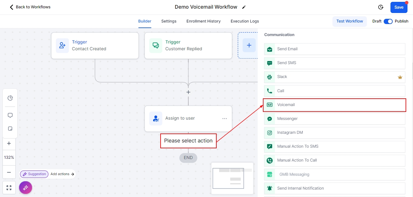 The Voicemail action lets you send pre-recorded voicemail messages directly to your contacts, adding a personal touch to your automated workflows. This feature ensures you can communicate important messages efficiently while maintaining a professional tone.