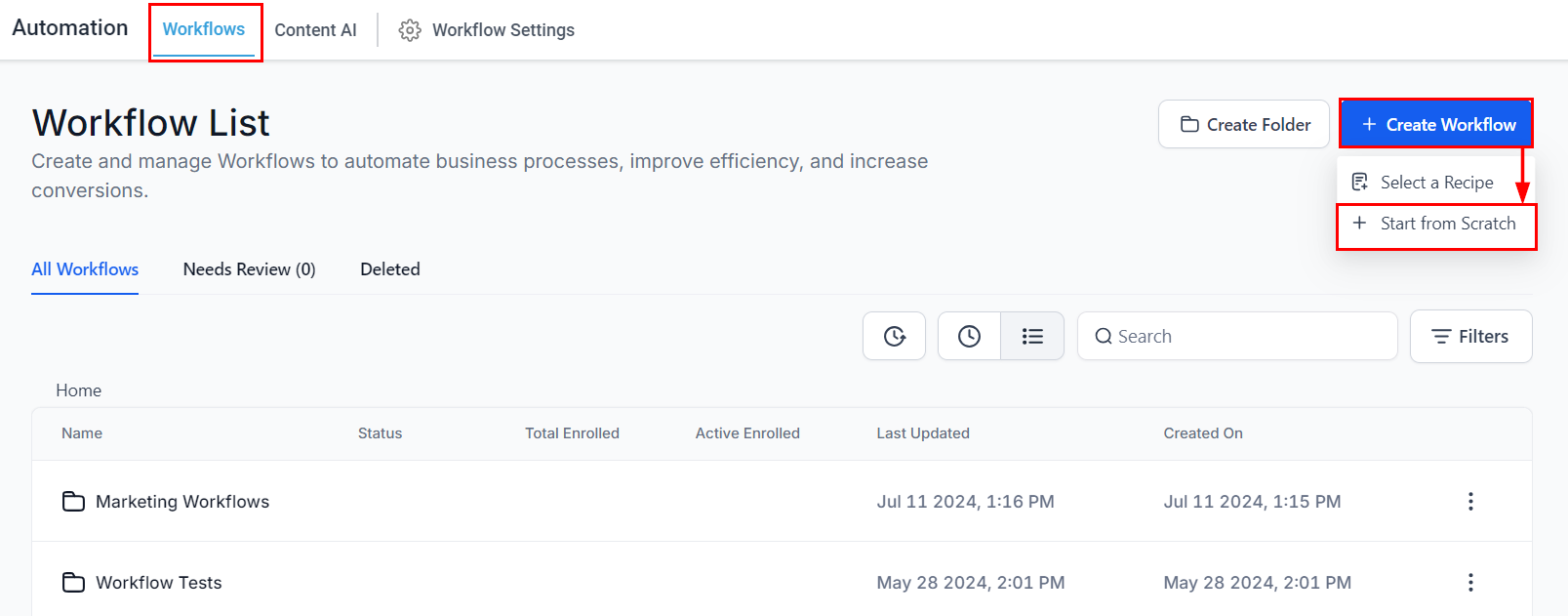 Navigate to Automation> Workflows > Create Workflow > Start from Scratch.