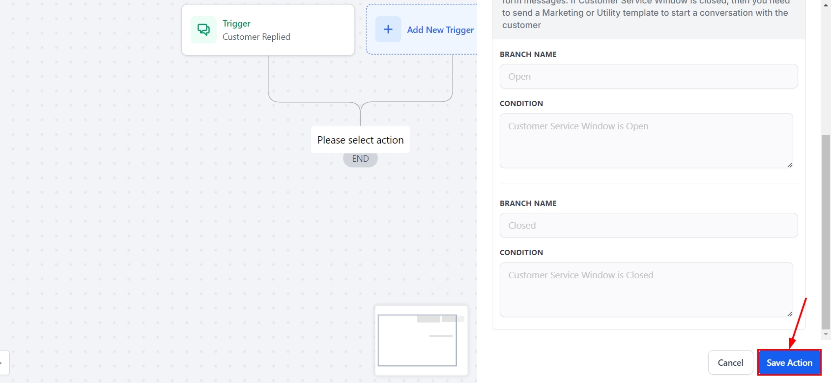 Add an action by clicking the plus icon and selecting "WhatsApp: Customer Service Window Check."