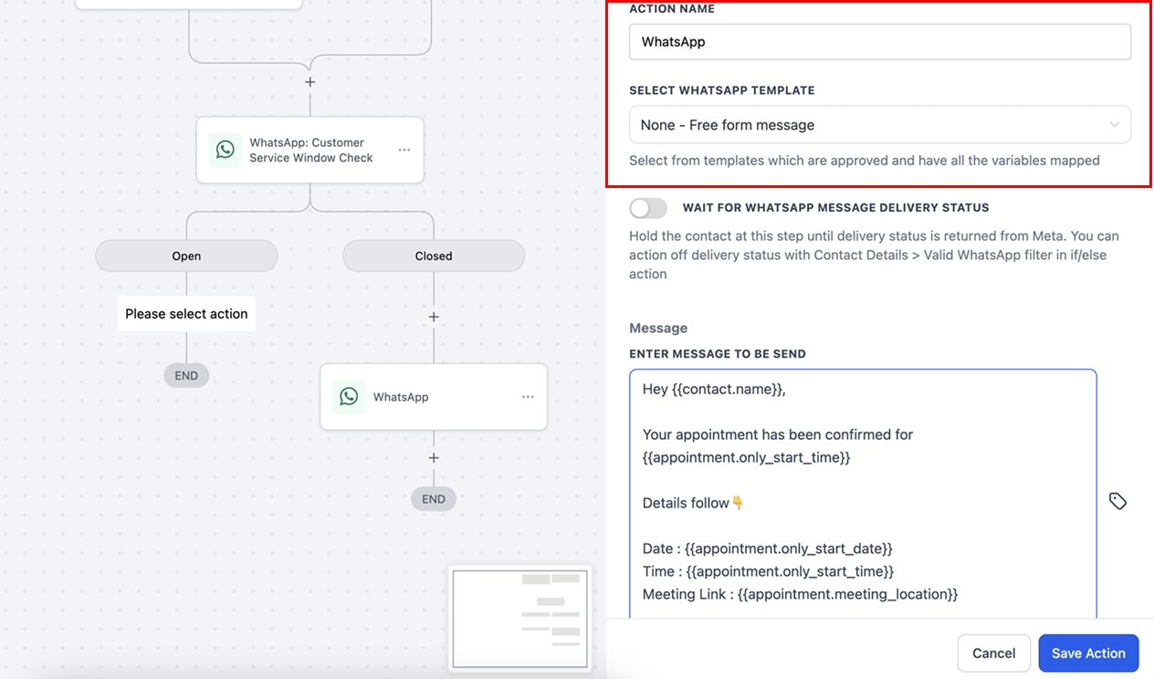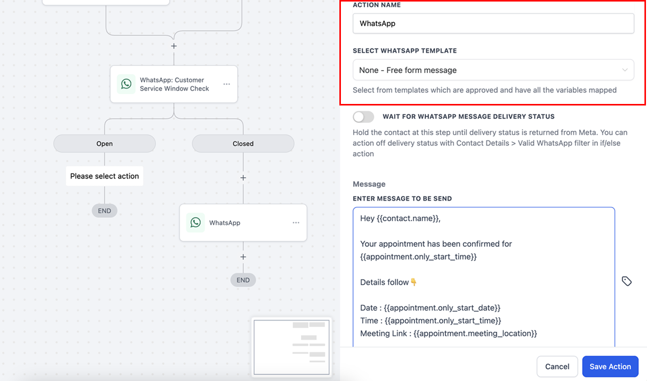 Open Branch: Select the WhatsApp action and choose "None - Free-form message." This allows you to send unlimited messages during the open window, using the 1,000 free service conversations.