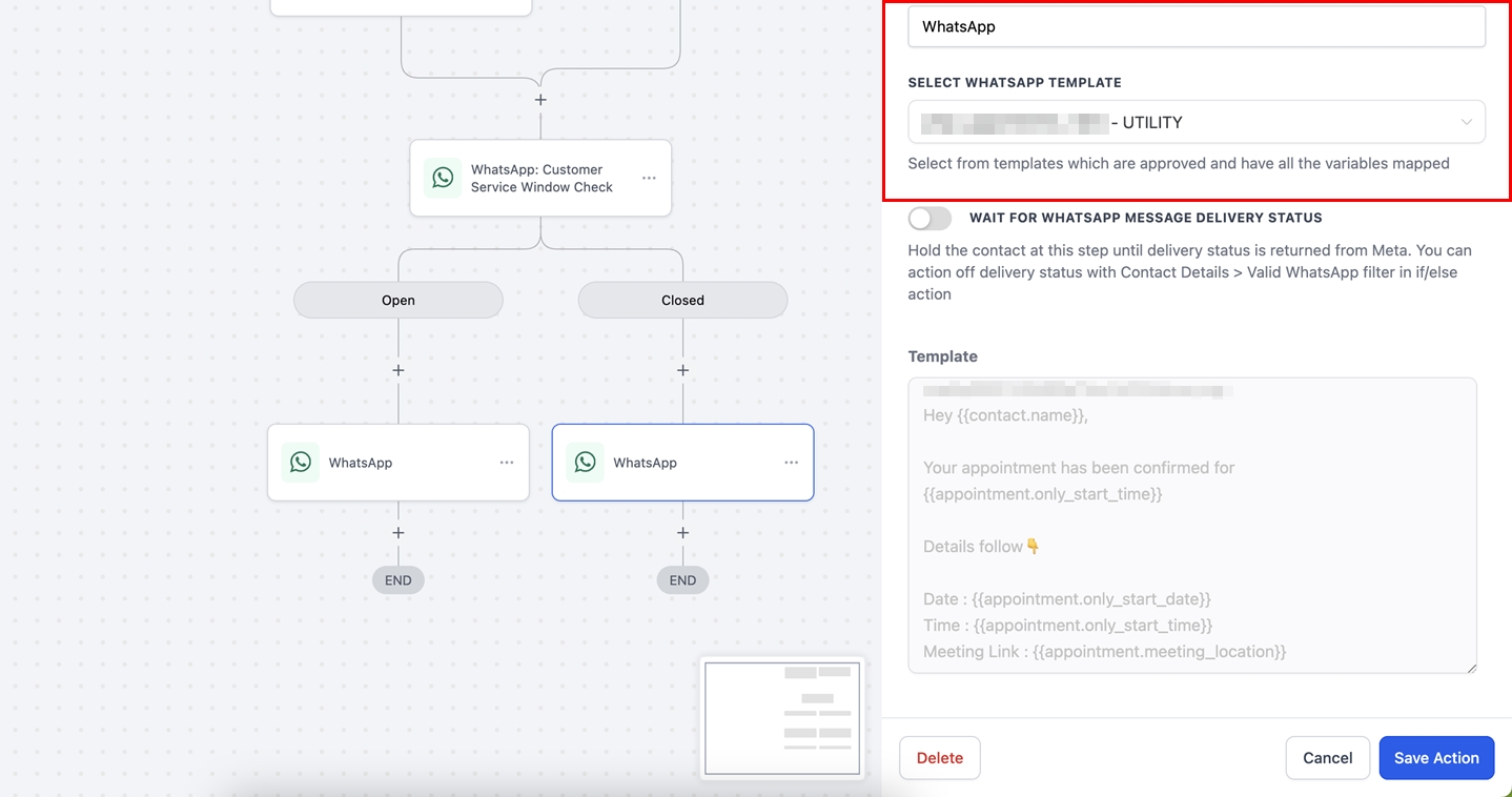 Closed Branch: Choose a WhatsApp action and select a marketing or utility template to initiate a new conversation.