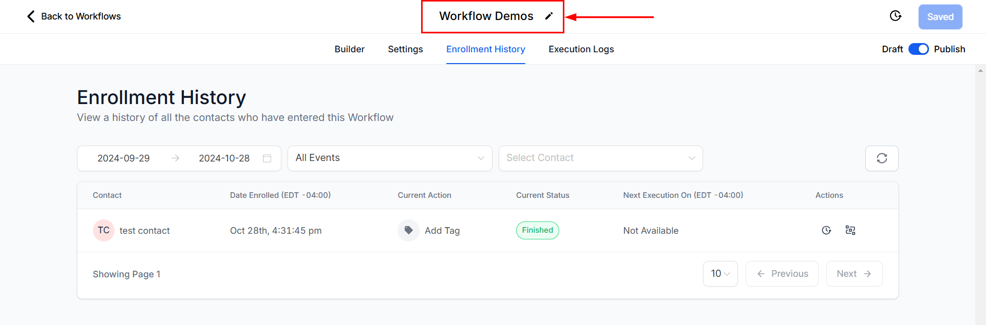 The Enrollment History Tab within workflows provides a list of contacts who have entered the selected workflow. It displays important details, including the contact name, the date each contact began the workflow, and their current status, and allows you to access additional information such as their contact path and execution history.