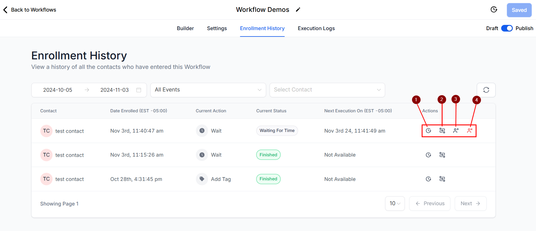 In the Actions column, you can review each contact’s execution history (1), view their execution path (2), advance the contact to the next workflow step (3), or remove the contact from the workflow (4). For contacts who have already completed the workflow, only their execution history and path will be accessible.