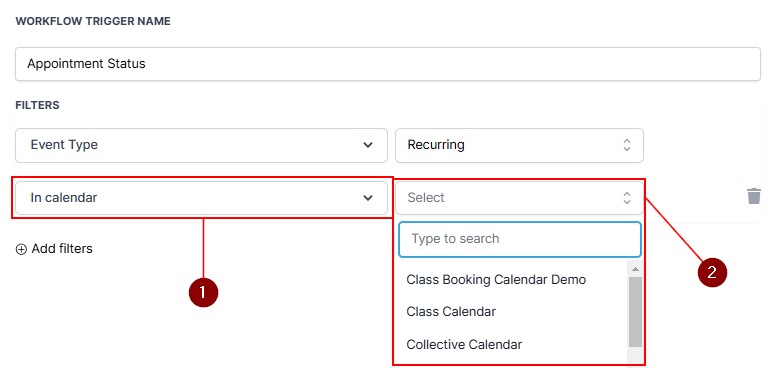 You can use the “In Calendar filter” to trigger the workflow when an appointment status has changed in a specific calendar. Once you choose the In Calendar filter, you will see another dropdown appear for you to select the calendar you would like to use.