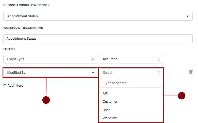 If you want the trigger to fire when a modification is made to it, you can use the Modified By filter. Once you've chosen this filter, you can select the modification that should trigger the workflow; API, Customer, User, or Workflow.