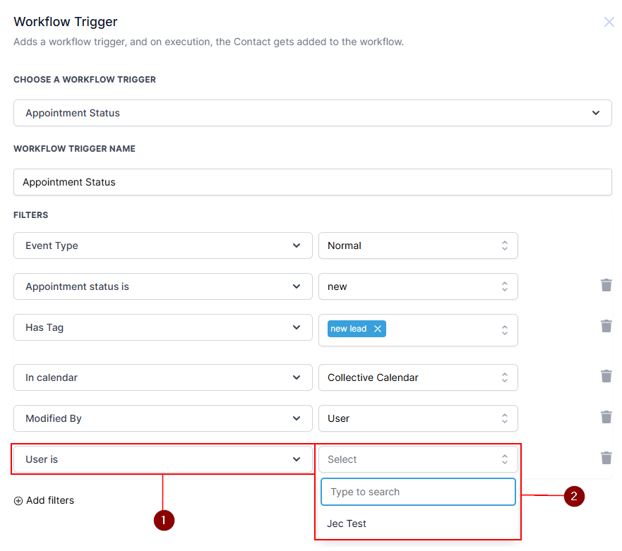 The User Is filter will trigger a workflow when the appointment status is changed with an appointment linked to a specific team member. Once you've selected the "User is" filter, a dropdown will appear where you can select the team member.