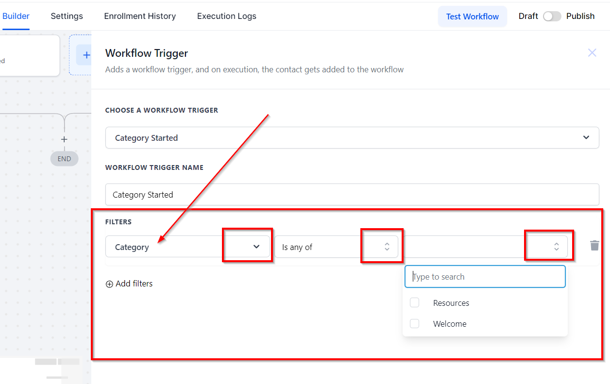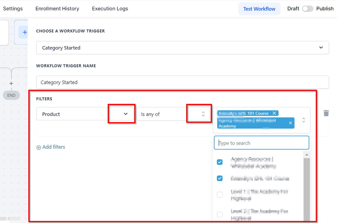 You can add filters from here by clicking Add Filter and selecting Product. Next, you will need to select โIs any ofโ or โIs none of.โ Your next step in setting up your trigger is to select the product category youโd like to trigger your workflow.