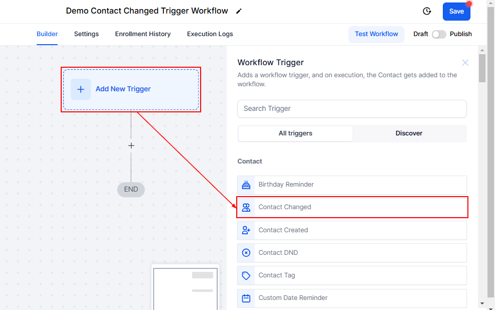 To get started, click on Add New Trigger and select Contact Changed. This trigger allows you to stay on top of contact updates and automate responses based on specific changes.