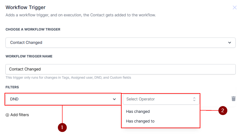 Has Changed To: When you select the "Has changed to" filter option, this workflow will trigger when the DND status of a customer changes to the specific DND option. For example, if you want to confirm with your team members when a customer opts out using the DND-enabled setting, you can fire this workflow ONLY when DND gets enabled on a contact record.