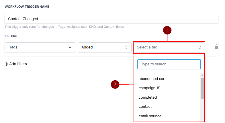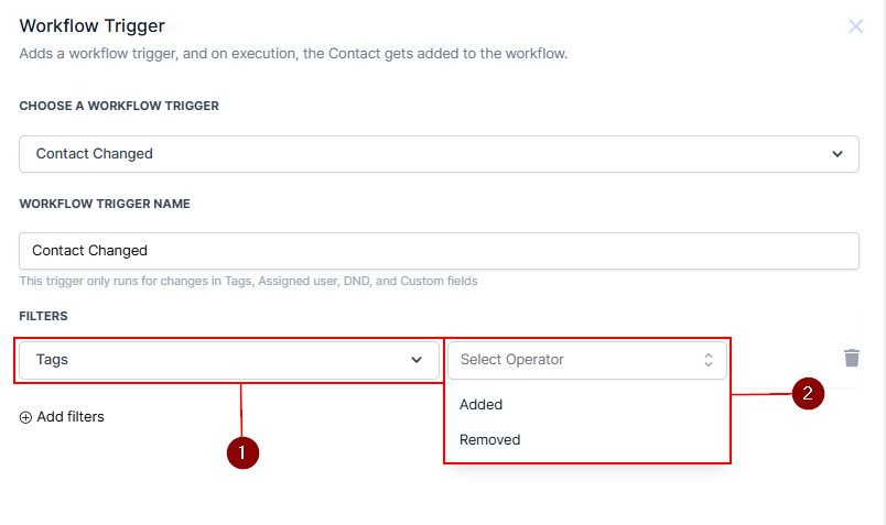 The Tags feature enables you to trigger a workflow only when you add or remove a tag from a contact. When you select the Tags filter, a new dropdown will appear for you to select Added or Removed.
