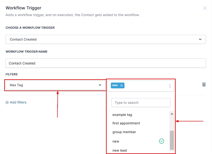 Use this filter to activate workflows only when a contact is assigned a specific tag. Simply select the desired tag from the CRM, and the workflow will run when a contact matches this tag.