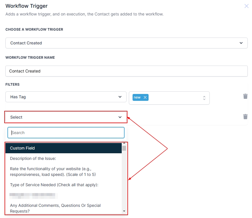 Click Add Filters, and select the relevant Custom field to trigger the workflow when a contact submits data through a form on your website that collects information via a custom field. This will ensure that the workflow only fires when a contact completes the custom field with the required data.