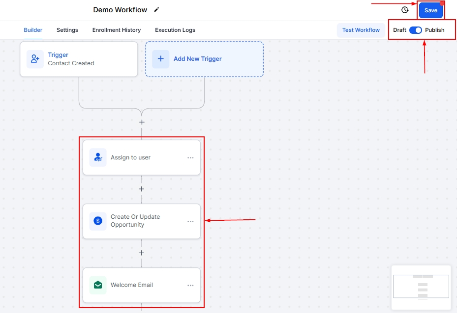 📌NOTE: To publish workflows, you must establish a workflow trigger and action. Without both, you can only save the workflow and not publish it.