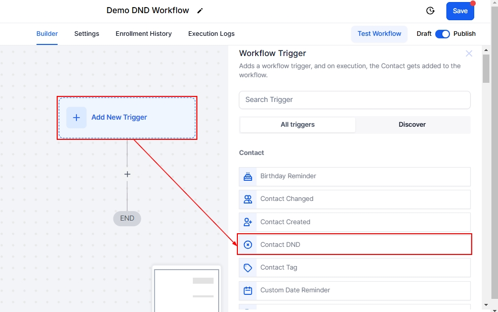 To begin, click the Add New Trigger button and select Contact DND.