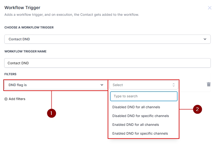 Filters help refine when the Contact DND trigger activates. You can use the following options to tailor workflows based on contact preferences. Use the DND Flag Is filter to determine if the workflow triggers when the DND flag is enabled or disabled. Add the filter by clicking + Add Filters and selecting DND Flag Is. Choose one of the following: