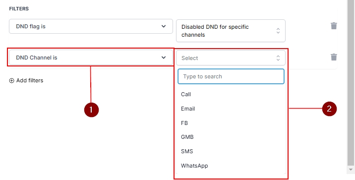 When you select the Disabled DND for specific channels or Enabled DND for specific channels trigger, you must further define the channel. Add the DND Channel Is filter and select the desired channel from the dropdown menu (e.g., SMS, email, GMB).