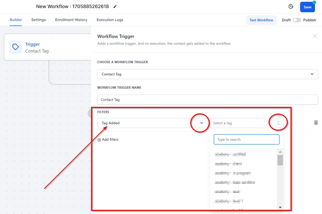 To trigger the workflow when a tag is added to a contact, click the filters dropdown and select Tag Added. Next, select the tag you want to use as a trigger.
